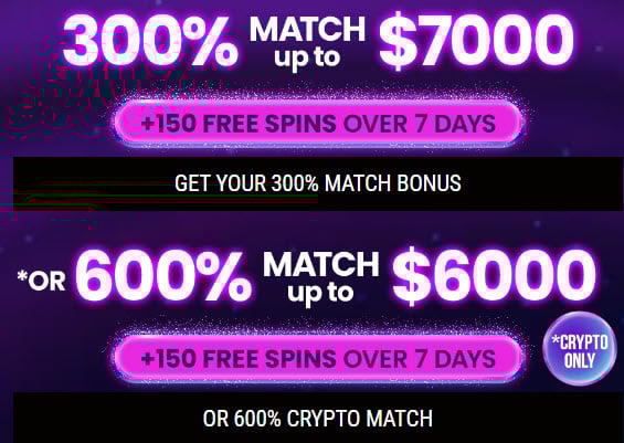 - 300% Match Bonus up to $7,000 + 150 Free Spins – Spread over the first deposit or initial period (details on allocation not fully specified on homepage). Minimum deposit and exact wagering requirements are not prominently listed; players should navigate to the promotions or cashier section to confirm code (if required), playthrough (typically high in similar platforms), eligible games, and any restrictions such as country exclusions or game contributions. Standard conditions apply—verify directly on the site as offers can change.
